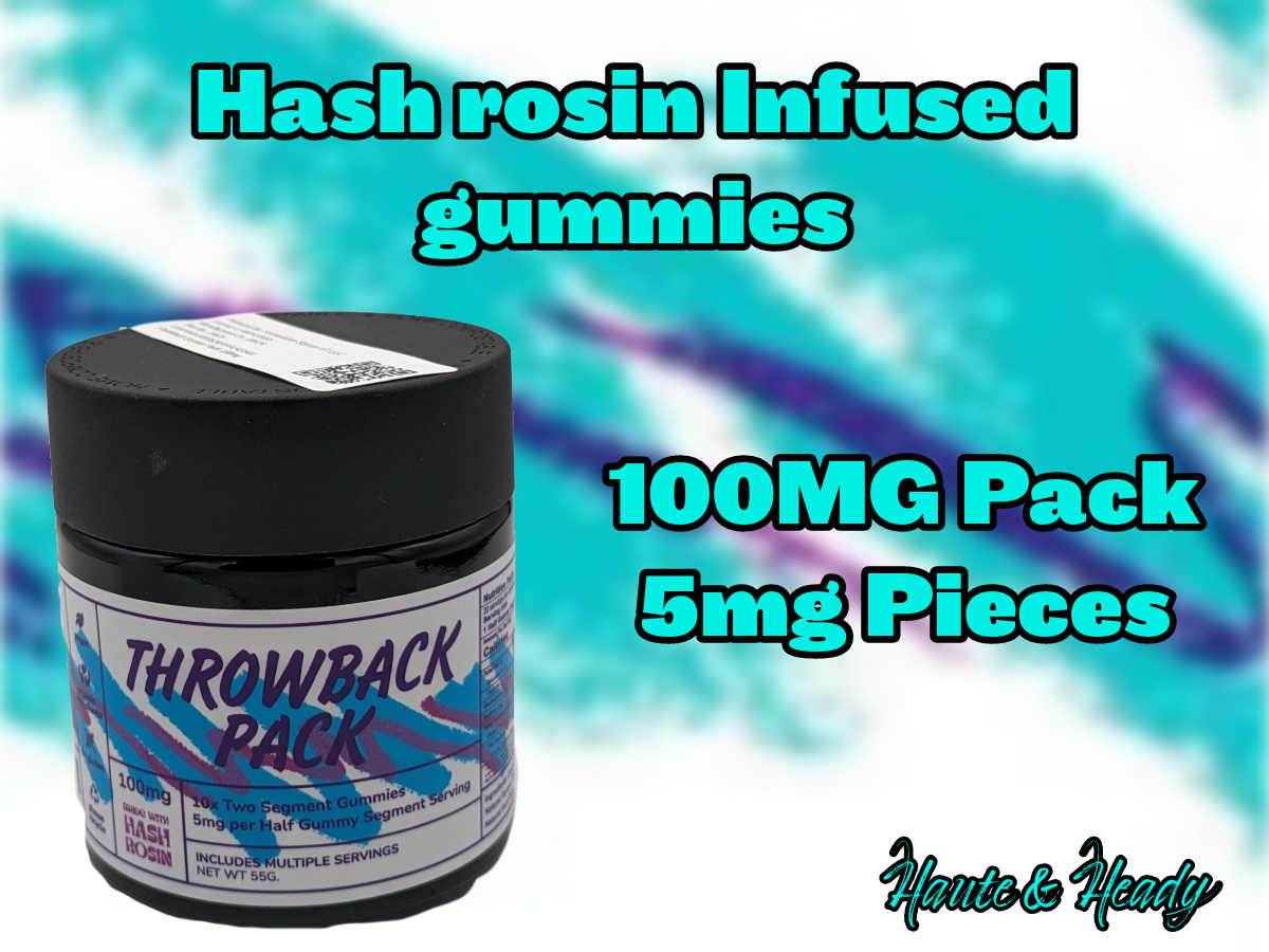 These 100mg packs of 10x 10mg split dose gummies feature a hash rosin infusion and mixture of 4 great nostalgic flavors from the 80s and 90s; Cali Cooler (Capri Sun), Space Drink (Tang), Polynesian Punch (Hawaiian Punch), and Ecto Chiller (Ecto Cooler)!